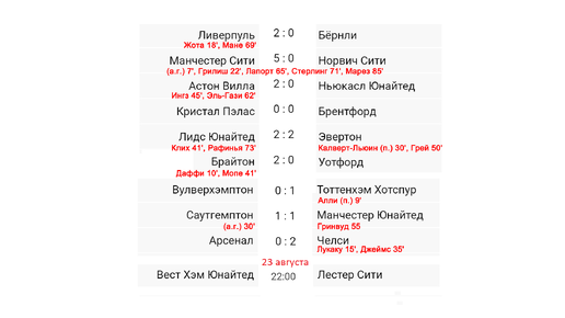 Чемпионат Англии (АПЛ). Результаты 2 тура, расписание + таблица Испании, Италии, Франции, Германии.