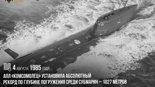 4 августа 1985 года АПЛ К-278 «Комсомолец» установила абсолютный рекорд по глубине погружения среди субмарин — 1027 метров