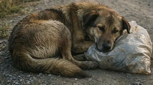 На обочине сидел щенок, сжимая в зубах потрепанный пакет. Машины проносились мимо, ни одна не останавливалась…