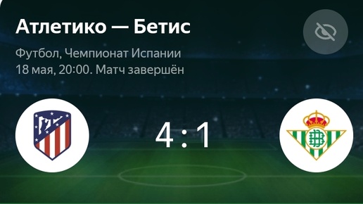 1. Атлетико Мадрид - Бетис (4:1) - Дата: 19 мая 2025 года (37-й тур Ла Лиги) . - Голы: - Альварес (10', 75'), - Ле Норман (45+3'), - Форнальс (67', за Бетис), - Корреа (90+6'). - Итог: Атлетико уверенно победил, закрепив 3-е место в турнирной таблице. Бетис остаётся на 6-й позиции . 2. Барселона - Вильярреал (2:3) - Дата: 19 мая 2025 года (37-й тур Ла Лиги) . - Голы: - Перес (4', за Вильярреал), - Ямаль (38'), - Лопес (45+5'), - Комесанья (51'), - Бьюкенен (80')...