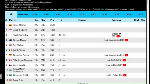 🎾🏆 Live ATP Race на 28 февраля 2026: 1. Карлос Алькараз 2. Новак Джокович 3. Даниил Медведев Подпишись на Эйс и точка