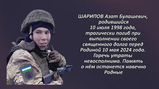 ШАРИПОВ Азат Булашевич, родившийся 10 июля 1998 года, трагически погиб при выполнении своего священного долга перед Родиной 10 мая 2024 года. Его жизнь была яркой вспышкой мужества и самоотверженности, навсегда оставившей след в сердцах тех, кто знал и любил его.