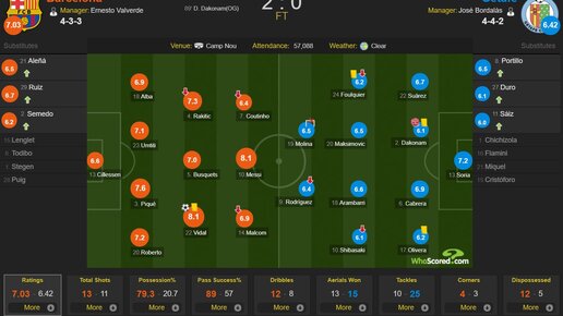 Голы: Видаль 39, Месси 89. «Барселона»:Силлессен, Роберто, Пике, Умтити, Альба, Видаль, Бускетс, Ракитич (Аленья 62), Малком (Нелсон Семеду 78), Лионель Месси, Коутиньо (Руис 69)