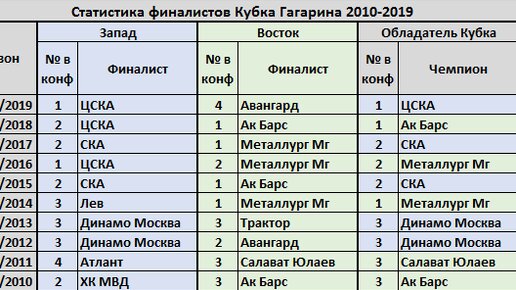 Рассмотрим статистику финалистов Кубка Гагарина за десять сезонов с 2009/2010 по 2018/2029, клубы с каких мест в конференциях доходили до финала, с каких становились Чемпионами. Первый сезон КХЛ 2008/2009, когда сетка плей-офф строилась не по конференциям в расчет брать не будем. Забегая вперед, можно сказать что вероятность финала Йокерит vs Барыс оценивается в 9%. Увы, в финалах Кубка Гагарина никогда не играли команды занявшие ниже 4 места в своих конференциях. По шесть раз в финалах плей-офф...