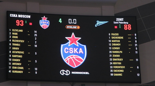 23 ноября на площадке «Мегаспорта» в Москве в домашнем матче баскетболисты ЦСКА обыграли «Зенит» из Петербурга. Счет – 93:88 (17:31, 25:18, 27:21, 24:18). В турнирной таблице ЦСКА располагается на втором месте с 22-мя очками, проведя 12 игр. УНИКС – на третьем месте, «Зенит» - на четвертом, а на первом – «Локомотив-Кубань» (23 очка). ЦСКА (Москва) – «Зенит» (Санкт-Петербург) - 93:88 (17:31, 25:18, 27:21, 24:18). Первая четверть осталась за гостями. После трехочкового броска Астапковича гости ответили таким же дальним – 3:3...