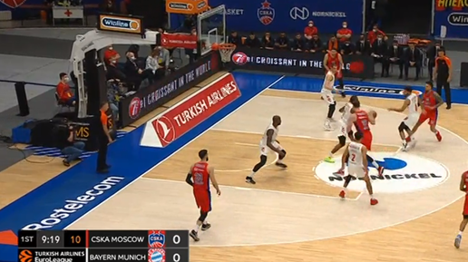 Начало 1 четверти за Баварией. Но ЦСКА быстро отыгрывает трёху от мюнхенцев.