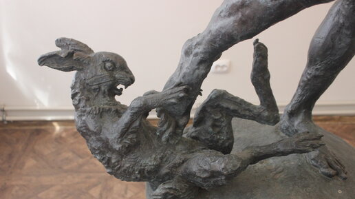 Заяц имеет острые зубы, я надеюсь, что они помогут ему спасти свою жизнь. Рядом на стене висит раздавленная ворона.