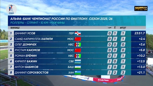 У мужчин на чемпионате России в Чайковском по летнему биатлону состоялся спринт. 1. Даниил Усов - 23.51,7 (1) 2. Карим Халили - +2,4 (1) 3. Олег Домичек - +3,6 (0) А Усов всем нам сюрприз преподнес. Выскочил как черт из табакерки и сдвинул с первого места не кого-нибудь, а Халили. У Даниила сегодня и скорость, и меткость, и настрой - все в наличии. Не так часто мы вспоминаем об Усове, но фамилия уже примелькавшаяся. Зимних подиумов категорически не хватает. Но что делать, не всем юфть лидерами. Посмотрим, как будет дальше...