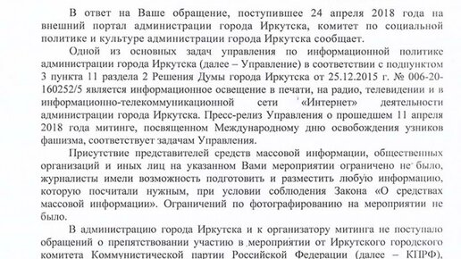 «В администрацию города Иркутска и к организатору митинга не поступало обращений о препятствовании участию в мероприятии от Иркутского городского комитета Коммунистической партии РФ, Иркутского областного комитета КПРФ, иных лиц в письменной либо устной форме».