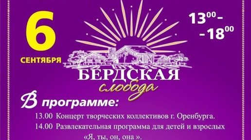 6 сентября с 13:00 на площади у ДК «Орбита» (ул. Заводская, 34) пройдёт фестиваль «Бердская слобода». Вас ждут: 🎪 Выступления циркачей и творческих коллективов 🎨 Ярмарка, мастер-классы и выставка 🍰...