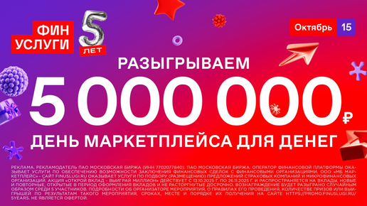 Поделюсь условиями акции от финансового маркетплейса Финуслуги, которую он проводит в честь своего 5-летия. Акция дает возможность любому клиенту площадки, оформившему через нее любой банковский вклад на протяжении ближайшего месяца, выиграть один из пяти призов по 1 млн рублей. Условие, которое необходимо выполнить, всего одно: открыть через Финуслуги любой банковский вклад в сумме от 10 тысяч рублей на любой срок в период с 13 октября по 12 ноября 2025 года. Все. Сам розыгрыш будет проведен автоматически,...