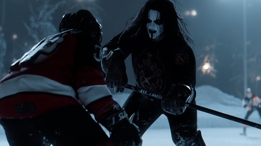 Создано на основе запроса: Abbath body checking another player in the boards, outdoor hockey game, spotlights on the ice, very long black hair, pale skin, black metal facepaint, winter, dark night, full moon, --- Автоперевод: Abbath Body проверяет другого игрока в досках,...