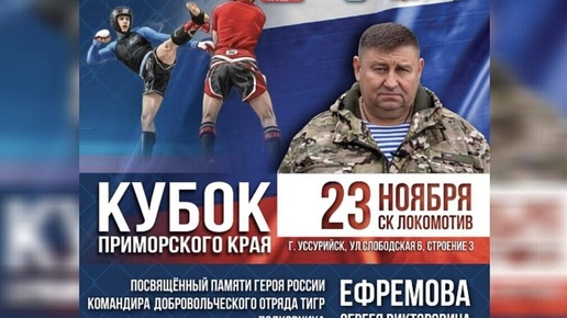 23 ноября в Уссурийске пройдет Кубок Приморского края по смешанным единоборствам (ММА), посвященный памяти Героя России Сергея Ефремова. Турнир соберет более 200 спортсменов из 10 муниципалитетов края. Вход для зрителей свободный, сообщили в правительстве региона. Соревнования состоятся в спортивном комплексе «Локомотив» на ул. Слободской, 6. Предварительные поединки начнутся в 11:00, торжественное открытие запланировано на 14:00, после чего пройдут полуфиналы и финалы. «Сергей Ефремов был настоящим героем и верным другом нашей федерации...