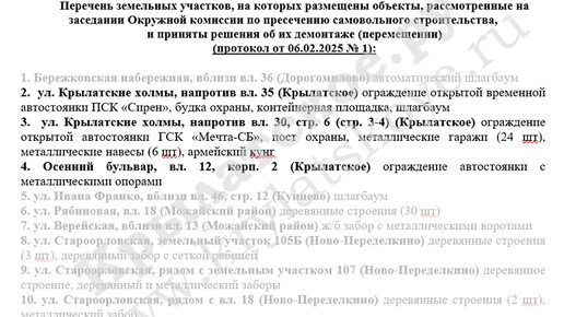 Ограждение автостоянки ПСК «Сирен», а также будка охраны, контейнерная площадка и шлагбаум, к сносу которых приступили накануне, - не единственные объекты, уже признанные самостроем. Согласно решению Окружной комиссии по пресечению самовольного строительства в ЗАО, в ближайшее время будет снесен еще один гаражный кооператив - ГСК «Мечта-СБ». В отличие от ПСК «Сирен», ГСК «Мечта-СБ» находится дальше от оживленных магистралей района, но также расположен на улице Крылатские холмы и на границе с одноименным природным парком...