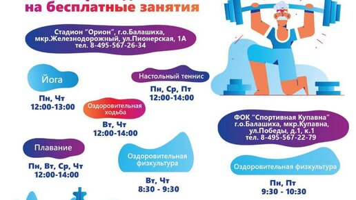 «Спортивная школа «Орион» приглашает женщин от 55 лет и мужчин от 60 лет активно провести свое свободное время на занятиях программы "АКТИВНОЕ ДОЛГОЛЕТИЕ" Губернаторская программа "Активное долголетие" создана для поддержания активного образа жизни, занятия спортом, обучению новому и получению удовольствия от общения друг с другом 👉 Расписание занятий: 💪 Оздоровительная физкультура - Пн, Пт 9:30-10:30, ФОК "Спортивная Купавна" 💪 Оздоровительная физкультура - Вт, Чт 8:30-9:30, стадион...