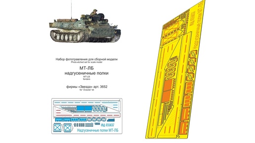 Севастопольская "Микродизайн" выпустила фототравленые надгусеничные полки для модели МТ-ЛБ в масштабе 1/35 от "Звезды": МТ-ЛБ надгусеничные полки (каталожный номер МД 035637)