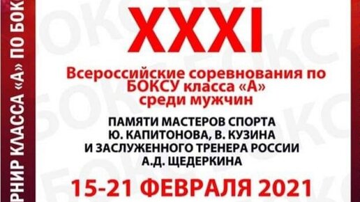 XXXI ВСЕРОССИЙСКИЕ СОРЕВНОВАНИЯ ПО БОКСУ КЛАССА «А» В ЛЮБЕРЦАХ Согласно Единому календарному плану межрегиональных, всероссийских, международных физкультурных мероприятий и спортивных мероприятий Минспорта России на 2021 год в период с 15 по 21 февраля в г...