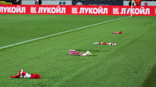 Болельщики московского "Спартака" после очередного поражения выбросили шарфы на поле.