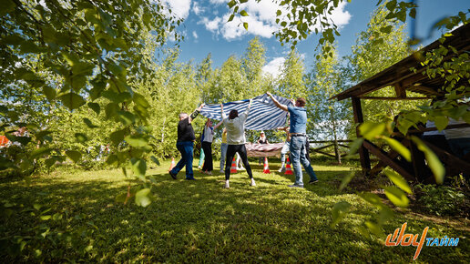 Лето, тимбилдинг, площадка «Командный волейбол». Делимся на две полукоманды, нужно за ограниченное время как можно чаще и точнее коллективными усилиями перебросить мяч с одной большой тканевой «ракетки» на другую.