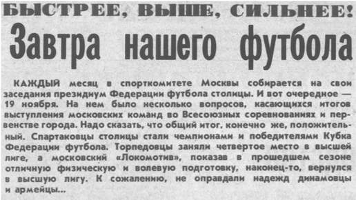 *** Шесть лет работы с командой ребят (1970 года рождения) подошли к концу. Теперь можно и подвести итоги: что сделано, что ещё можно сделать? Если брать выступления в первенстве города Москвы по футболу, то команда, с которой я работал все эти годы, дважды была первой, дважды второй и дважды третьей. Владела они и Кубком столицы по футболу. В этом году футболисты завоевали право участвовать во всесоюзных соревнованиях среди специализированных школ. Юные торпедовцы под руководством тренера В. Филатова, доукомплектовав коллектив четырьмя игроками младшей команды (1971 года, тренер Н...
