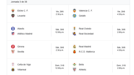 SABADO 30 DE AGOSTO ALAVES - ATLETICO MADRID X DISNEY PLUS A LAS 12:00 -SABADO 30 DE AGOSTO REAL OVIEDO - REAL SOCIEDAD X DSPORTS - SABADO 30 DE AGOSTO GIRONA - SEVILLA X DISNEY PLUS A LAS 14:30 - SABADO 30 DE AGOSTO REAL MADRID - MALLORCA X DSPORTS A LAS 16:30 - DOMINGO...
