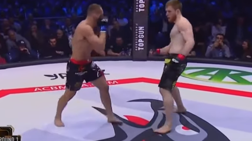 Бой Ибрагима Чужигаева против Вячеслава Василевского. По комплекции бойцы похожи. Ченец прямиком из Грозного его вес 84 кг, а боев у него 10: 7 побед и 4 поражения. Вячеслав из Нижнего Новгорода. Начался бой не так предсказуемо, как получилось в итоге. Чеченец доминировал над Вячеславом, пробивал разные удары ногами и двоечки руками. Один раз хорошо выполнил удар ногой с разворота, но я так понимаю это были всего лишь понты. Вот еще один красивый удар ногой от Чужигаева . Василевский же пока ведет себя очень осторожно, видимо выжидает подходящего момента...