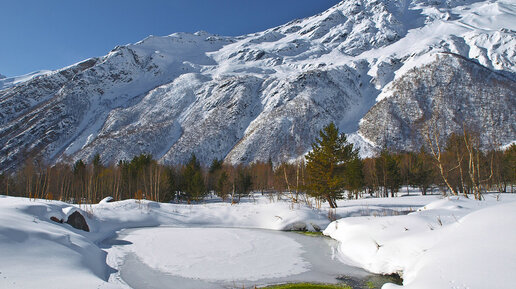 После того как мы переночевали на Поляне Азау, ранним утром выдвинулись к подъёмнику на Поляну Чегет. От Поляны Азау подъёмник на Чегет находится всего в пяти километрах. До открытия подъёмника у нас оставалось время, которое мы решили уделить посещению Поляны Нарзанов. Здесь прямо из-под земли бьют минеральные источники. В глаза сразу бросается необычный цвет воды. Точнее не цвет, а осадок который образовался на дне этих ручьёв. Он ярко рыжего цвета, это говорит, что воды здесь очень насыщенны железом...