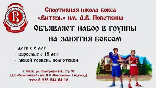 Спортивная школа бокса «Витязь» им. А.В. Поветкина объявляет о наборе в группы для занятий боксом. Приветствуются как юные спортсмены, так и взрослые.