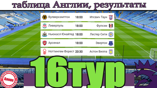 Чемпионат Англии по футболу. Итоги 16 тура. Таблица, расписание, результаты (+Ла Лига, Серия А, Бундеслига)