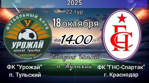 В рамках 22 тура чемпионата Краснодарского края по футболу 2025🏆⚽ 18 октября в 14:00 состоится футбольный матч между ФК «Урожай» из поселка Тульского и ФК «ГНС-Спартак» из Краснодара. Просим поддержать...