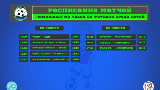 ✨ ЧЕМПИОНАТ МО ЧЕХОВ ПО ФУТБОЛУ и ФУТЗАЛУ🏆 😉 Расписание матчей Чемпионата муниципального округа Чехов по футболу среди детей сезона 2025/2026, которые пройдут уже в эту субботу и воскресенье 🎉 🗓22 и 23 ноября 🚫 Возраст: 3+ 🏢 ДС «Олимпийский» им...
