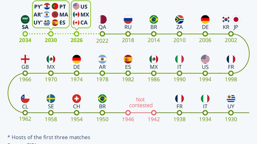 ФИФА продолжает ломать традиции футбола и в этот раз они объявили, что Испания, Португалия и Марокко примут чемпионат мира 2030 года. Кроме того, в связи со столетием первого чемпионата мира, который состоялся в Уругвае в 1930 году, в Монтевидео также пройдет церемония, а также пройдут три матча открытия в Уругвае, Аргентине и Парагвае. Таким образом, чемпионат мира 2030 года будет иметь беспрецедентный формат, поскольку он пройдет в шести странах и на трех континентах (Африка, Европа и Южная Америка)...