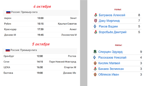 В 10-м туре РПЛ «Динамо» на выезде уверенно справилось с «Крыльями Советов» - 3:2. «Ахмат» разгромил на своём поле «Акрон» - 3:0. Московский «Локомотив» обыграл казанский «Рубин» - 1:0. «Краснодар» потерял очки в южном дерби с «Ростовом» - 0:0. В заключительном матче субботы «Зенит» не скромно победил «Оренбург» – 5:2...