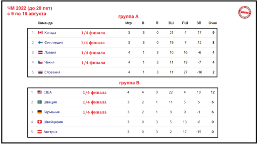 Кто в плей-офф ЧМ по хоккею 2022 (U20). Результаты 6 дня. Расписание. Таблица.