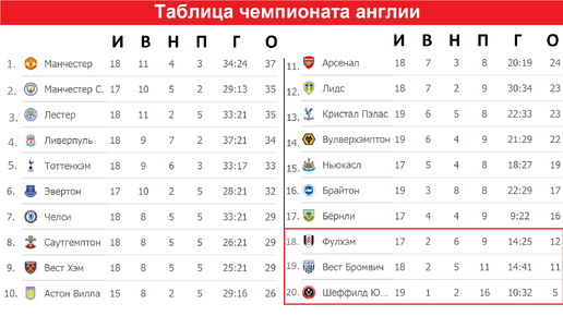 Чемпионат Англии по футболу. 19 тур. Таблица, расписание.