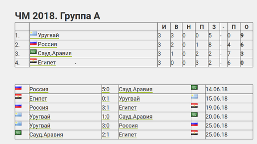 Удобная турнирная таблица чемпионата мира по футболу 2018 за 26.06.18