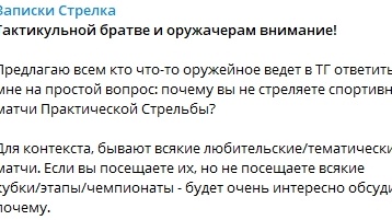 Из любопытства расспросил, почему люди не участвуют в спортивных матчах. Для меня крупный матч это главный фестиваль, регулярное или уникальное, почти праздничное действие, ожидаемое, то, ради которого работаешь. Как можно любит стрелять и не приехать на соревнование? Понятно, я мог предположить, но навыдумывать и узнать - разные вещи. Результаты превзошли мои ожидания и даже породили некоторые размышления. Для кого этот текст? Надеюсь для всех, но первей всего для организаторов Практической Стрельбы, т...