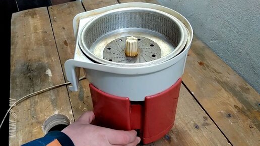 Сегодня я покажу и расскажу, куда применить старую советскую соковыжималку. Изготовим отличный станок, который стал мне верным помощником в моей мини мастерской в гараже. Для начала надо разобрать соковыжималку и взять электродвигатель, конденсатор, шнур питания и кнопку включения. Далее нам понадобится ролик, который я выточил из дерева на самодельном токарном станке из бруса 50х50 мм. Центральное отверстие и отверстия под крепеж я высверлил на стойке для дрели, которую сделал своими руками. Насаживаем...