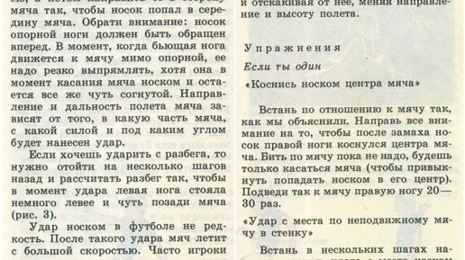Всем любителям поиграть в футбол посвящается. Самым первым ударом по мячу, которому учат в книге Цирика и Лукашина «Футбол», как ни странно является удар носком (пыром). Ни «щёчкой», ни подъёмом, а именно носком. Скорее всего это связано с тем, что технически выполнить этот удар по статичному мячу легче всего. По-моему, несмотря на недостатки этого удара, это самый недооценённый удар не только среди профессионалов, но и любителей. Мне много раз от разных игроков приходилось слышать, чтобы я так больше не бил...