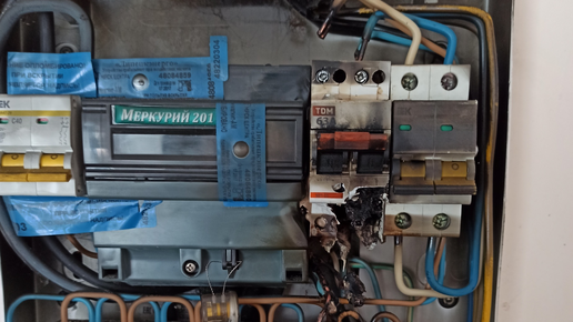 Хотел бы вам показать что может произойти если время от времени не заглядывать в свой электрощит. Началось все с того что мне позвонил мой знакомый с проблемой что пропало электричество в его доме.К его счастью я в этот день был дома. Приехал я через пол часа он показал где находится электрощит. Щиток был расположен в гараже на стене и уже на входе в гараж я почуствовал очень едкий запах горелой проводки. Вскоре после вскрытия крышки щитка я увидел этот ужас, часть проводки, счетчик и автоматы сгорели дочерна...