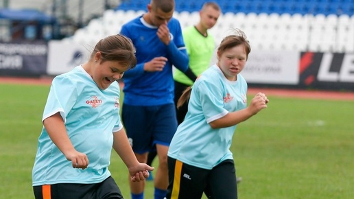 На стадионе втретились команда по адаптивной физкультуре с элементами футбола для спортсменов с синдромом Дауна «Дети Солнца» и ФК «Динамо». Мероприятие прошло в рамках Фестиваля спорта, посвященного Дню физкультурника.