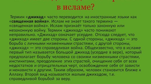 Джихад. Под этим словом абсолютное большинство людей, в том числе и из числа мусульман, понимают одно – исламисты объявляют кому-то священную войну. При этом в ход могут идти любые средства, допускается убийство всех и вся. Но что говорит Коран об этом. В этой книге джихад разделяется на великий и малый. Последний делится на мирный и военный джихад. А что означают эти термины? Великий джихад – это борьба мусульманина против своих пороков. Его еще называют нафс – джихад сердца. Самая сложная форма джихада, так как, не победив свои пороки, нельзя приступить к борьбе за величие своей веры...