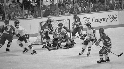 Карусель у ворот голкипера сборной СССР Сергея Мыльникова. Канадцы Клод Вилгрейн (18), Джим Пеплински (24), Стив Тамбеллини (11), отчаянно пытаются распечатать ворота советской команды. В обороне у наших лучшая пара защитников – Алексей Касатонов (7) – Вячеслав Фетисов (2) а также форварды второго звена – Вячеслав Быков (27) и Андрей Хомутов (15). Столько надежд родоначальники хоккея возлагали на Олимпийские игры, которые проходили на их земле в Калгари. 36 лет Канада не могла добиться успеха, и...