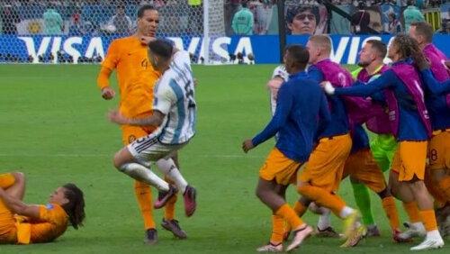 Футболисты сборных Нидерландов и Аргентины устроили потасовку на поле в четвертьфинале чемпионата мира-2022, сообщает Sports.kz. Это случилось в конце матча при счете 2:1 в пользу аргентинцев. В потасовке также приняли участие и запасные игроки. Видео можно посмотреть ниже. 😳😳😳 pic.twitter.com/ljTBSdrNb0 — EuroFoot (@eurofootcom) December 9, 2022 В составе сборной Аргентины голы забили Науэль Молина (35-я минута) и Лионель Месси (73-я, с пенальти); у сборной Нидерландов отличился Ваут Вегхорст (83-я)...
