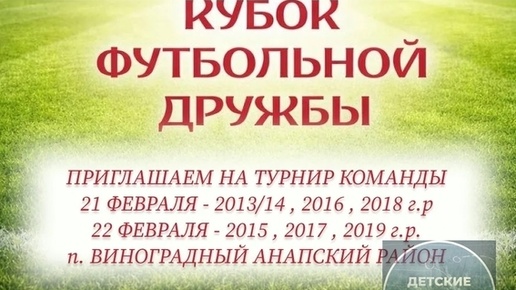 " 2013/14 2015 2016 2017 2018 2019 г.р. в п. Виноградный, Анапский район 🏆 ✅ НАЧАЛО 2⃣1⃣ февраля 🕗 2016 , 2018 г.р. начало в 8:00 🕑 2013/14 г.р. начало в 14:00 2⃣2⃣ февраля 🕗 2017 , 2019 г.р. начало 8:00 🕑 2015 г.р. начало 14:00 ✅ФОРМАТ 8х8 2013/14 и 2015 🥅 5*2 ВНЕ ИГРЫ ✔ 7х7 2016 🥅 5*2 6х6 2017 🥅 5*2 5х5 2018 и 2019 🥅 3*2 ✅ Искусственное поле отличного качества 🔝 ✅ ВРЕМЯ МАТЧА 25 минут без смены ворот ✅ КОЛЛИЧЕСТВО ИГР 4-5 ✅ ЗАЯВКА 2013-2016 до 15 человек + тренер 2017-2019 до...