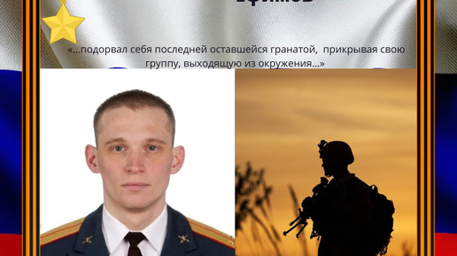 Александр Александрович Ефимов родился 25 ноября 1994 года в Можге Удмуртской Республики.После окончания школы поступил в Новосибирское высшее военное командное училище, год выпуска – 2018-й. Прохождение военной службы он начал в должности командира разведывательного взвода. Принимал участие в специальной военной операции на территории Украины, Луганской и Донецкой Народных Республик в должности заместителя командира роты разведывательного батальона. Александр Ефимов был тяжело ранен при боестолкновении с ВСУ в Харьковской области 25 марта 2022 года...
