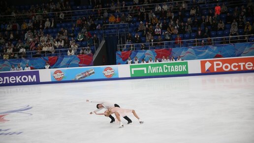 Пятый этап гран-при России открывали танцоры. Время трансляции немного сдвинулось на час. На официальном сайте федерации фигурного катания расписание так и не сменили. Танцы начинались не в 13:30, а в 12:30 по московскому времени. До сих пор весит эта устаревшая информация на сайте. В танцах первая разминка была очень слабого уровня. Для пар из регионов эти этапы гран-при - это возможность продемонстрировать себя большой аудитории, побыть на одном льду с лидерами. Ждать от них хорошей рёберности, глубоких дуг не приходится...