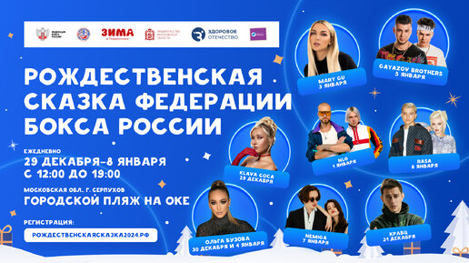 С 29 декабря 2023 года по 8 января 2024 года Федерация бокса России при поддержке правительства Подмосковья проведет благотворительную новогоднюю елку «Рождественская сказка Федерации бокса России», на которой выступят популярные российские артисты, такие как Ольга Бузова, Gayazovs Brothers и Клава Кока и другие. Об этом сообщила пресс-служба Министерства культуры и туризма Московской области. Мероприятие пройдет на пляже «Серпуховские Мальдивы». Здесь каждый день в течение всех новогодних каникул...