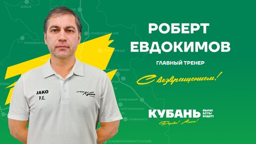 Сегодня, 11 апреля, стало известно о том, что ПФК «Кубань» назвал имя нового главного тренера. Им стал Роберт Евдокимов. Об этом появилось сообщение на официальном сайте клуба. Новый тренер уже приступил к работе с командой. На сайте говорится что «Решением руководства профессионального футбольного клуба «Кубань» главным тренером команды назначен Роберт Геннадьевич Евдокимов. Контракт с 54 -летнего специалистом рассчитан до окончания спортивного сезона 2025/26 гг». Там же отмечается, что Евдокимов «хорошо знаком жёлто-зелёным болельщикам...