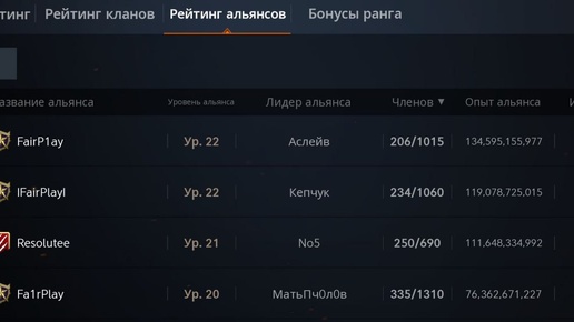 Топ-10 альянс по опыту на данный момент: 1. FairP1ay | Ур. 22 | 134,590,573,229 (кластер Зигхард) 2. IFairPlayI | Ур. 22 | 119,065,377,615 (кластер Леона) 3. Resolutee | Ур. 21 | 111,623,378,623 (кластер Эрика) 4. Fa1rPlay | Ур. 20 | 76,339,155,422 (кластер Барц) 5. FairPlay | Ур. 20 | 73,296,676,104 (кластер Эрика) 6...